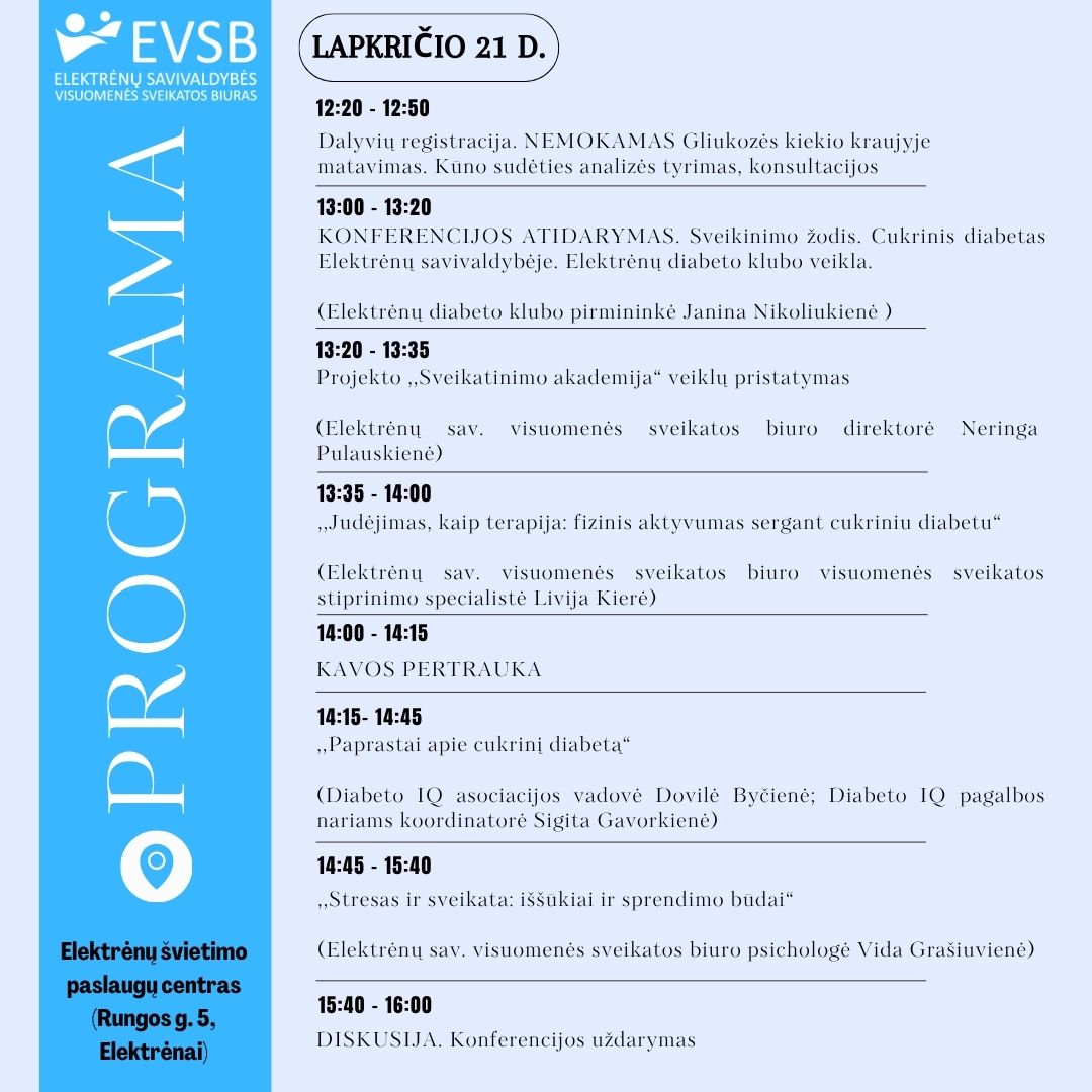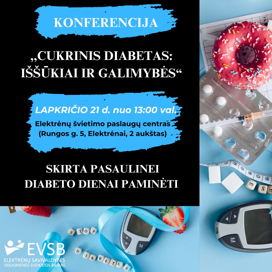 Cukriniu diabetu pasaulyje serga 425 milijonai žmonių – 1 iš 11 planetos gyventojų, ir vienas iš dviejų nežino, kad serga, nes liga lieka nediagnozuota. Tuo tarpu Lietuvoje diabetu serga daugiau nei 100 000 žmonių, todėl siekiant atkreipti visuomenės dėmesį į šią problemą Elektrėnų sav. visuomenės sveikatos biuras organizuoja švietėjišką konferenciją „DIABETAS: IŠŠŪKIAI IR GALIMYBĖS“