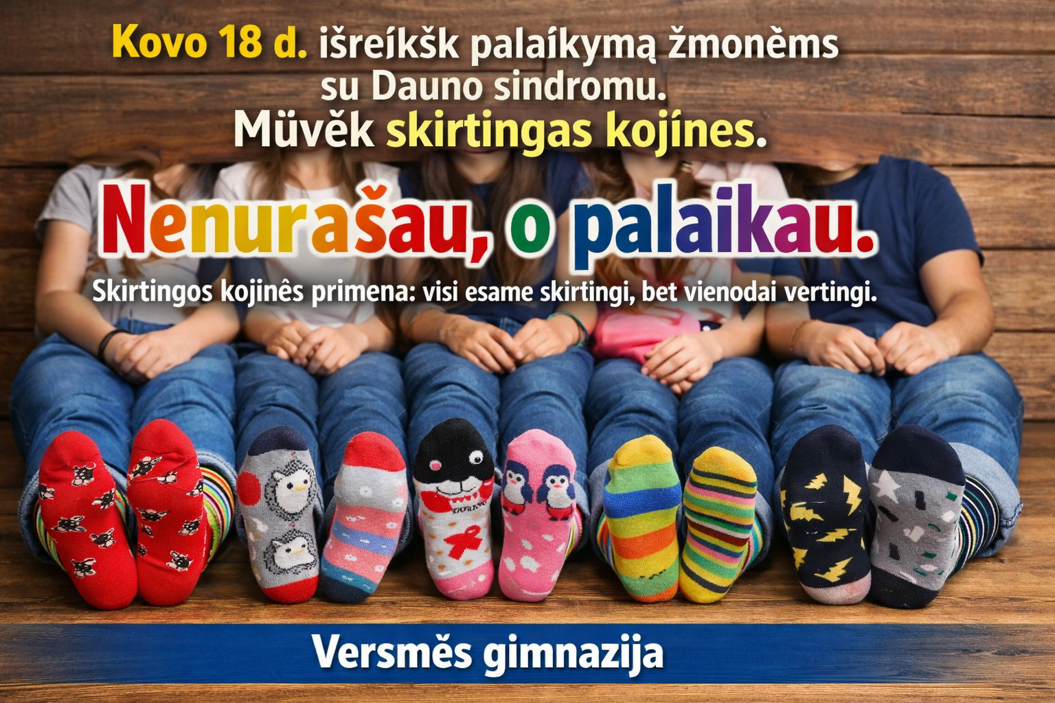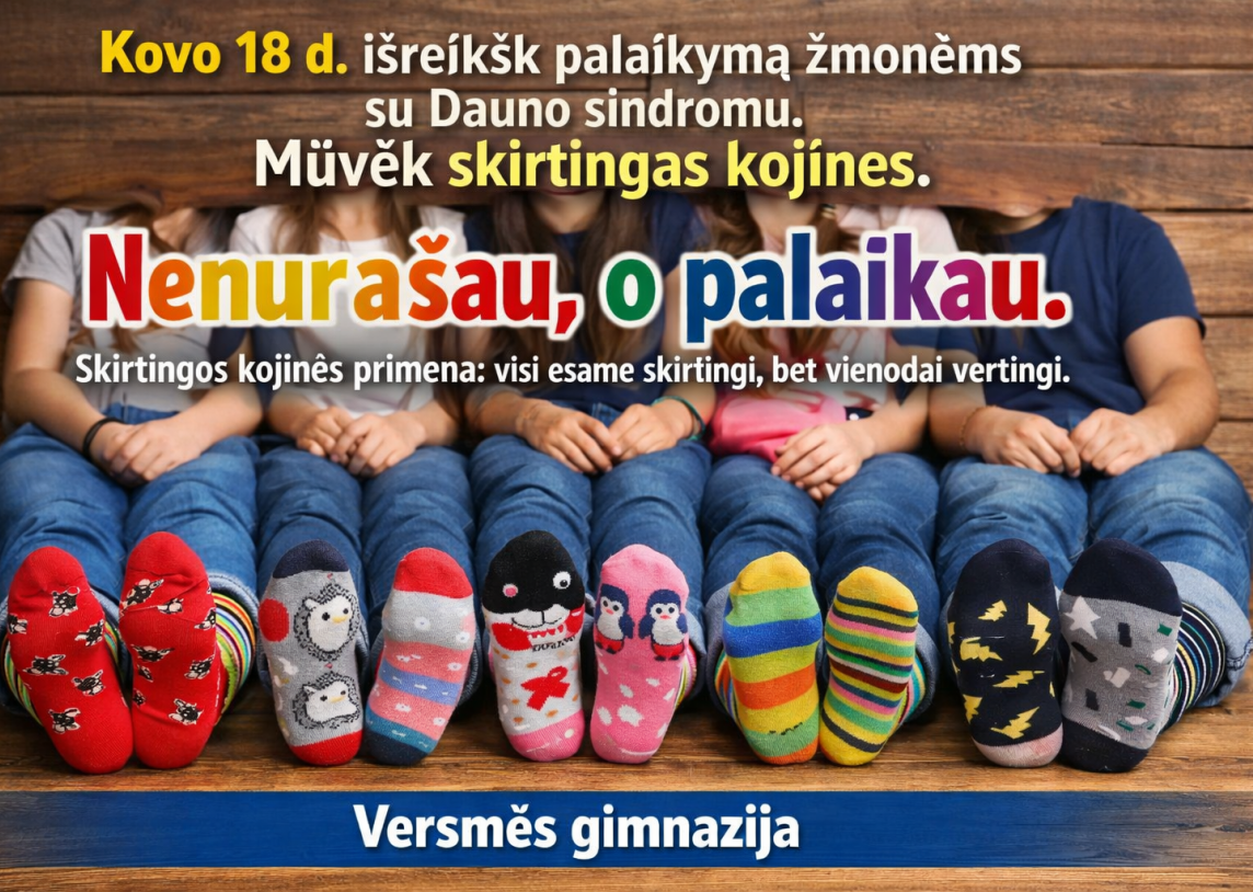 Kovo 18 dieną Elektrėnų „Versmės“ gimnazijoje buvo minima Pasaulinė Dauno sindromo diena. Šią dieną bendruomenė prisijungė prie iniciatyvos „Skirtingos kojinės“, simbolizuojančios žmonių įvairovę, toleranciją ir palaikymą. Iniviatyvą skatino socialinė pedagogė Aušra ir visuomenės sveikatos specialistė Renata.