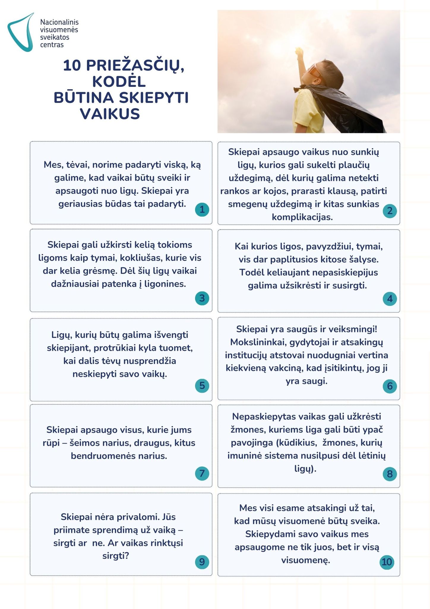 Užkrečiamosios ligos kasmet sudaro iki 20 proc. visų registruojamų ligų Lietuvoje, o vakcinomis šiandien galime kontroliuoti daugiau nei 25 ligas. Primename, kad skiepijimas yra svarbus visoms amžiaus grupėms, todėl rekomenduojame aktyviai domėtis vakcinomis valdomų ligų specifine profilaktika ir nepasikliauti nepagrįsta ar klaidinančia informacija.