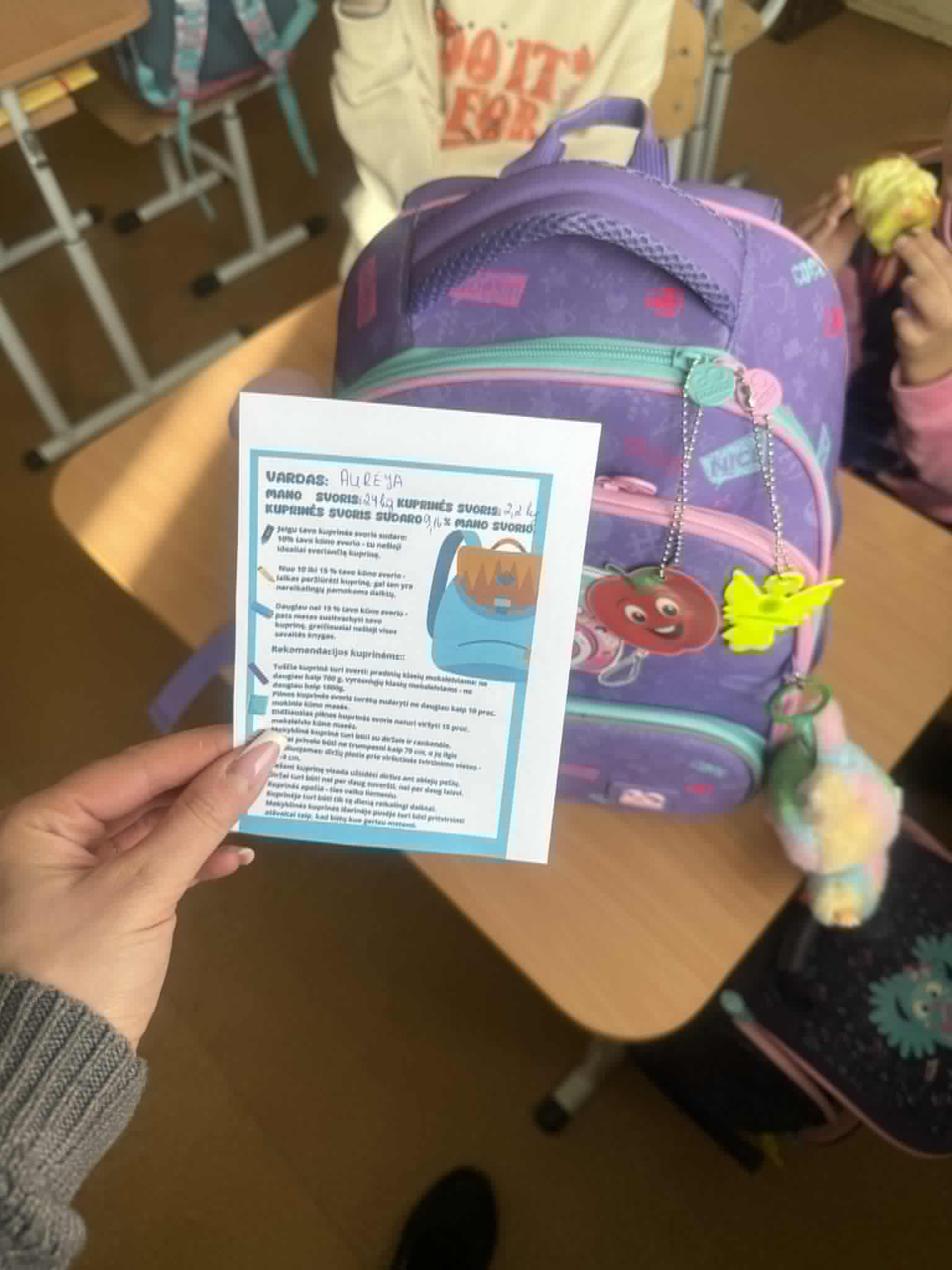 Akcijos metu buvo pasvertos visų pradinių klasių mokinių kuprinės. Visuomenės sveikatos specialistė vaikams priminė, kad kuprinės svoris neturėtų viršyti 10% vaiko kūno svorio. Didžioji dalis mokinių kuprinių atitiko rekomendacijas, tačiau pasitaikė ir tokių, kurios buvo per sunkios. Mokiniai kartu su mokytojais ir specialiste aptarė, ką galima padaryti, kad kuprinės taptų lengvesnės – palikti nereikalingus daiktus namuose, tvarkingai susidėti vadovėlius bei naudoti kuprines su plačiomis petnešomis ir atrama nugarai. Taip pat buvo įvertinta, ar visi vaikai turi atšvaitus, kurie gelbsti esant tamsiam paros metui.