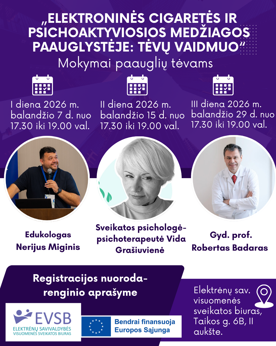 Edukologas Nerijus Miginis aptars, kaip atpažinti rizikos signalus, su kokiais iššūkiais gali susidurti paaugliai, kokią įtaką daro bendraamžiai bei kaip veikia paauglių motyvacijos ir savivertės mechanizmai. Taip pat bus pristatytos praktinės technikos, padedančios stiprinti gyvenimo įgūdžius, kritinį mąstymą ir atsparumą socialiniam spaudimui.