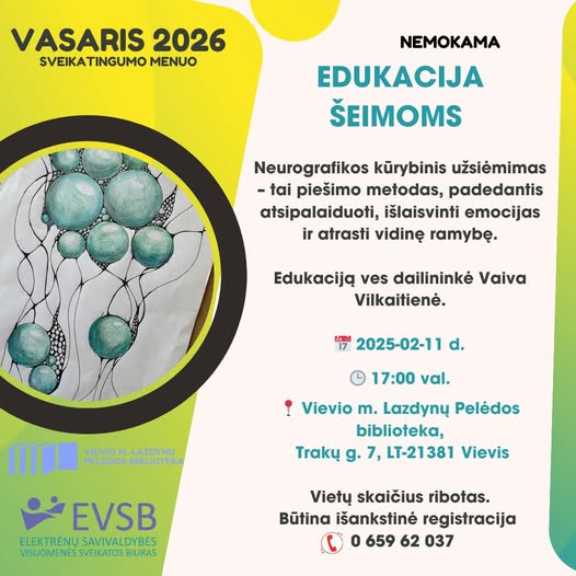 Kviečiame tėvelius su vaikais į nemokamą neurografikos kūrybinį užsiėmimą – jaukią kūrybinę patirtį visai šeimai, padedančią atsipalaiduoti, geriau pažinti emocijas ir kartu atrasti vidinę ramybę.