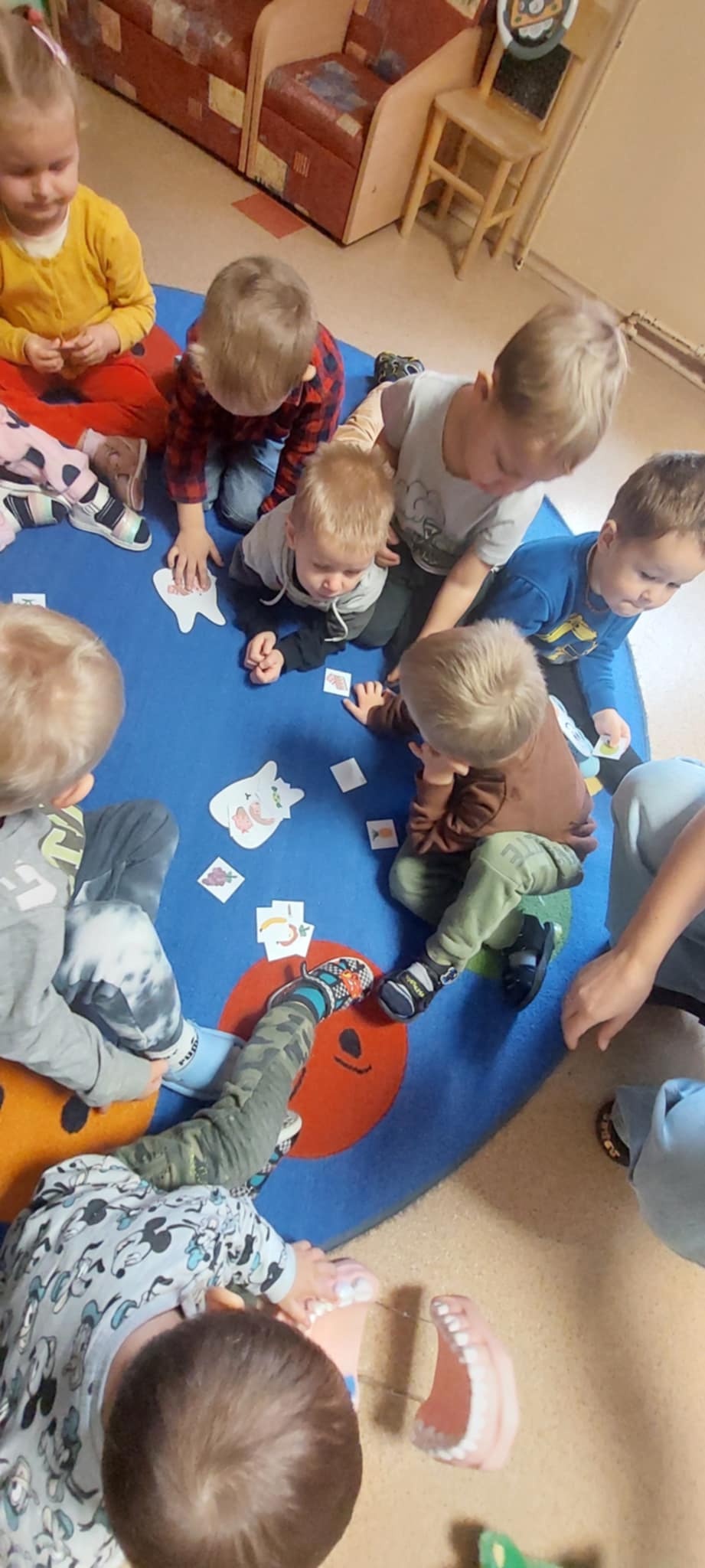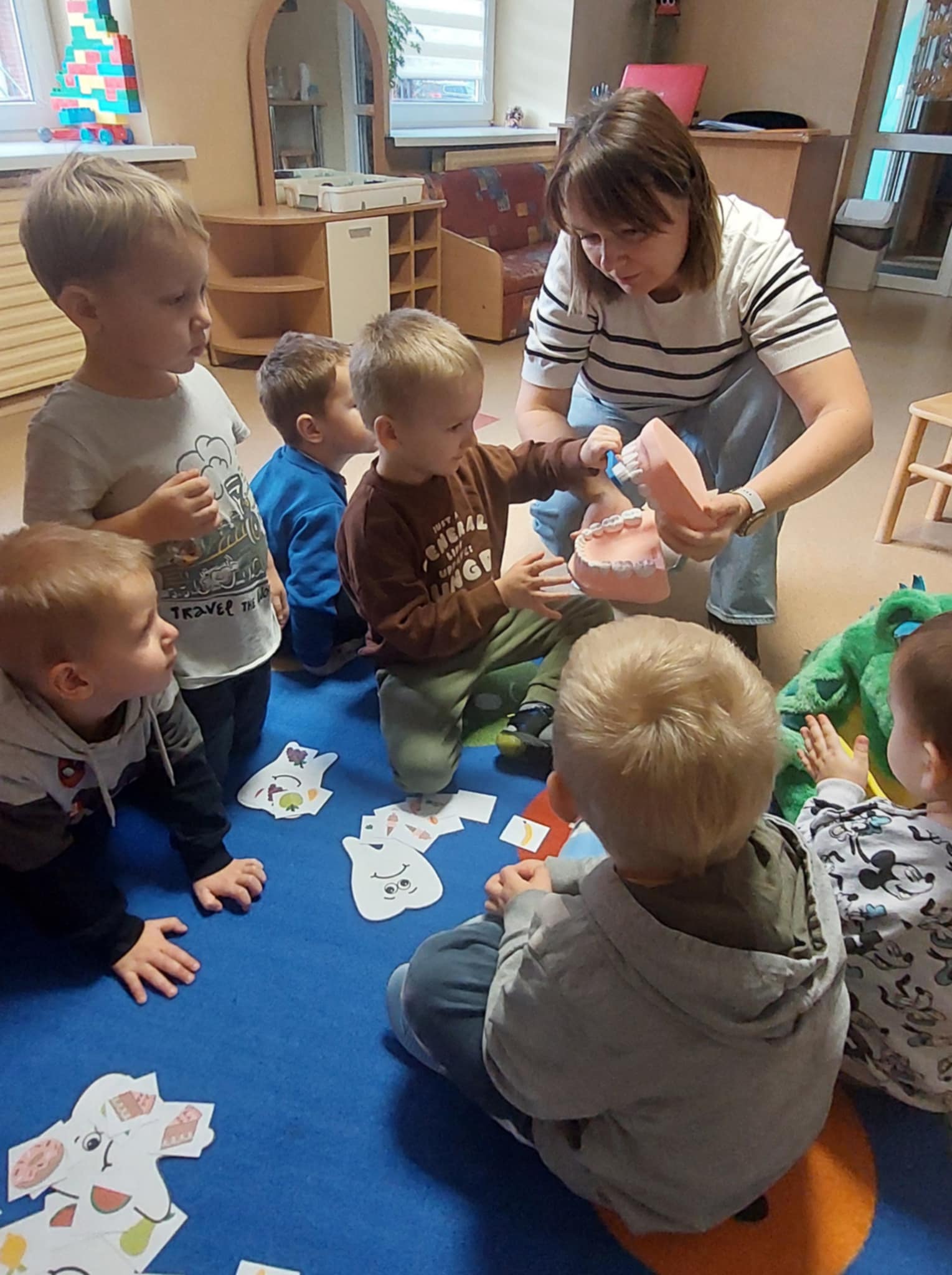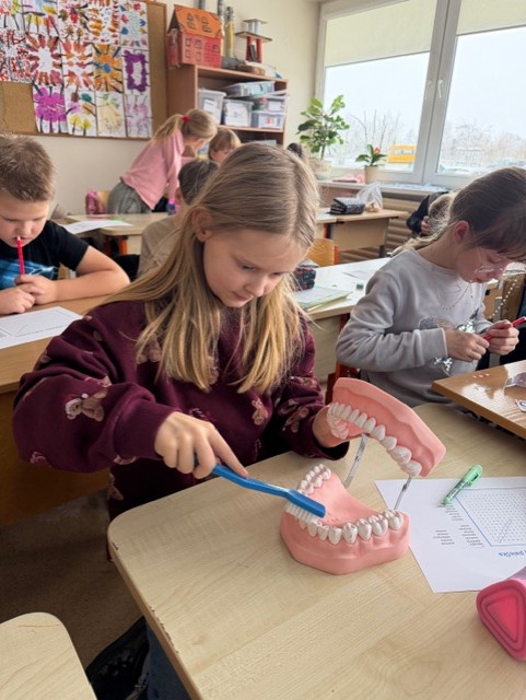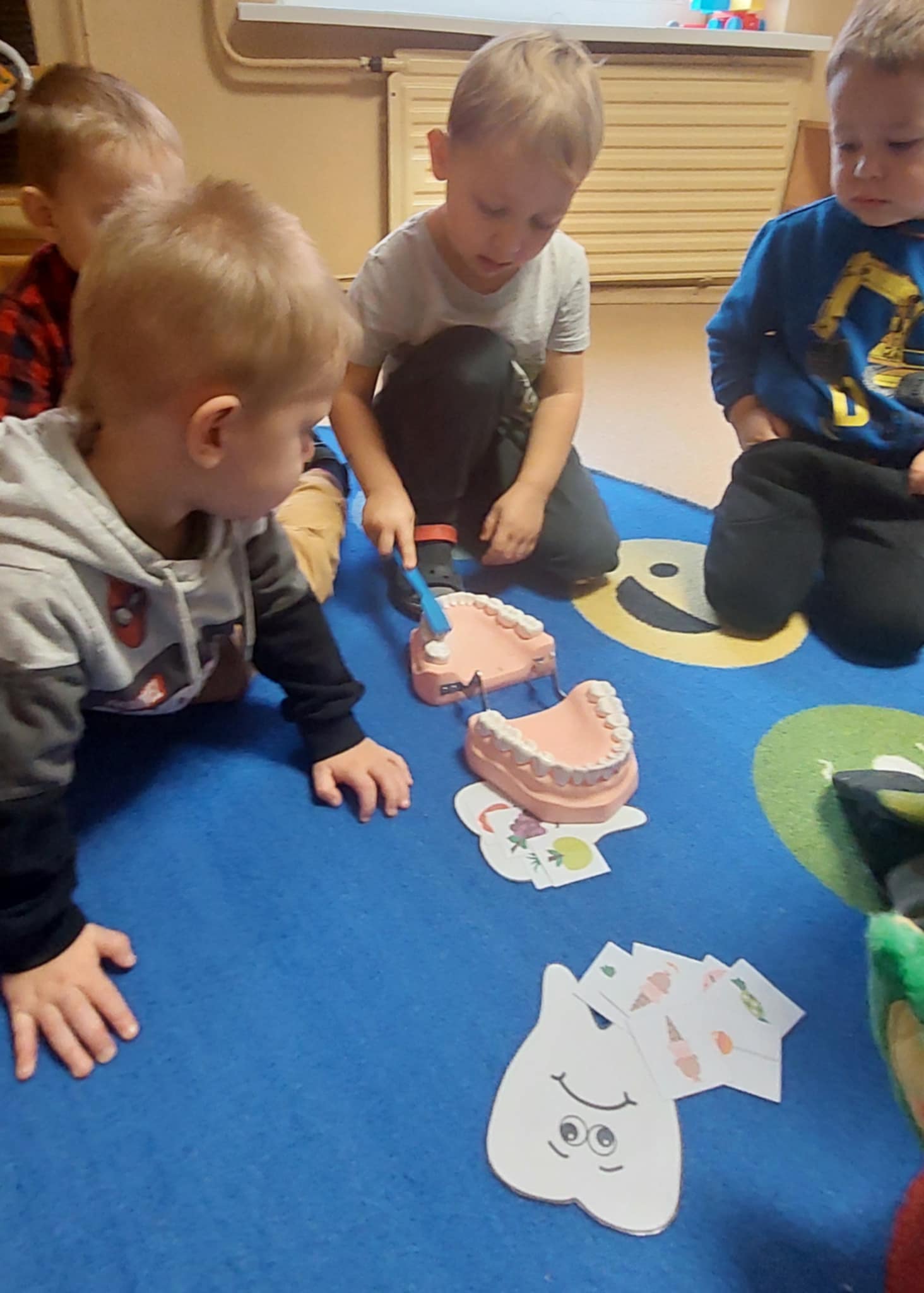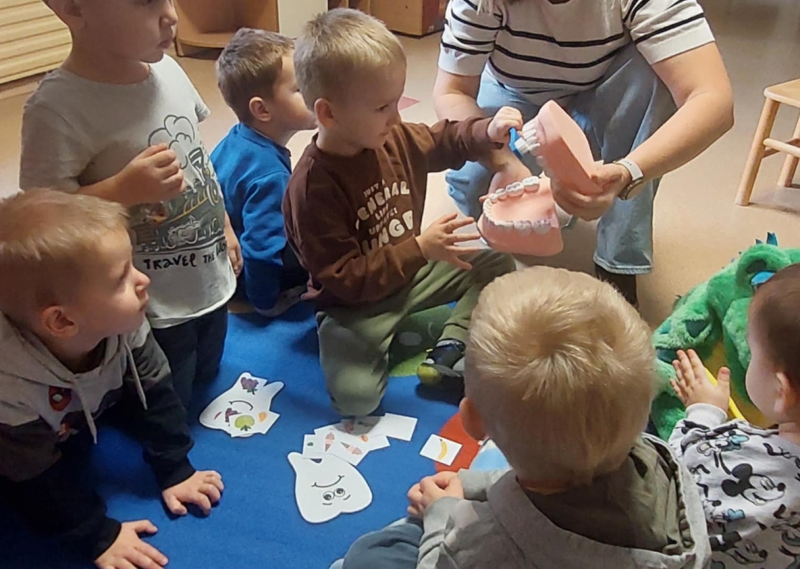 Kalbėjome apie tai, kas yra sveiki dantukai, kodėl jie kartais gali skaudėti ir kaip būtų galima to išvengti. Vaikai apžiūrėjo didelį, žaislinį dantų modelį ir specialų milžinišką šepetuką – taip jie mokėsi taisyklingų valymo judesių, suprato, kad dantis reikia valyti ne tik iš priekio, bet ir iš užpakalinės pusės, taip pat nepamiršti liežuvio.