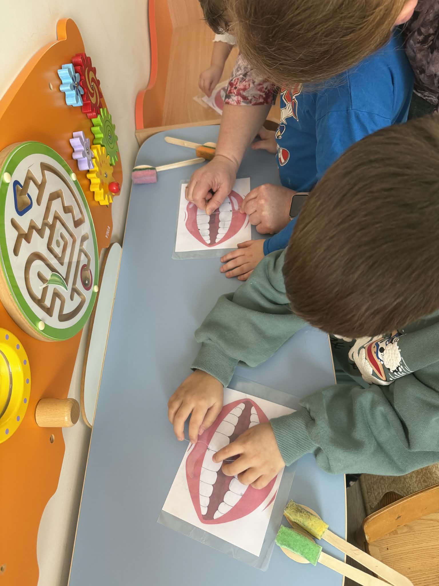 Pamokėlės metu buvo demonstruojama taisyklinga dantų valymo technika. Vaikai mokėsi, kaip tinkamai laikyti šepetėlį, kokiais judesiais valyti dantis bei kiek laiko turėtų trukti valymas. Praktinė veikla suteikė galimybę įtvirtinti žinias, vaikai ne tik valė dantukus su specialiai paruoštais šepetėliais ir šypsenos maketais, bet ir su tarpdančių siūlu.