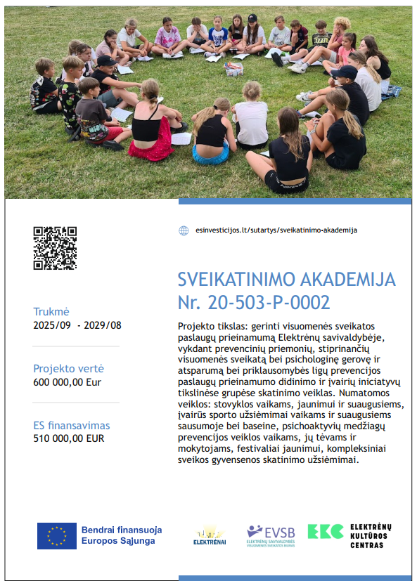 Elektrėnų savivaldybės visuomenės sveikatos biuras kartu su partneriais Elektrėnų savivaldybe ir Elektrėnų kultūros centru pradeda įgyvendinti projektą „Sveikatinimo akademija“ (Nr. 20-503-P-0002). 2025 m. rugsėjo 1 d. Elektrėnų savivaldybės visuomenės sveikatos biuras ir Centrinė projektų valdymo agentūra pasirašė sutartį dėl projekto „Sveikatinimo akademija“ įgyvendinimo.