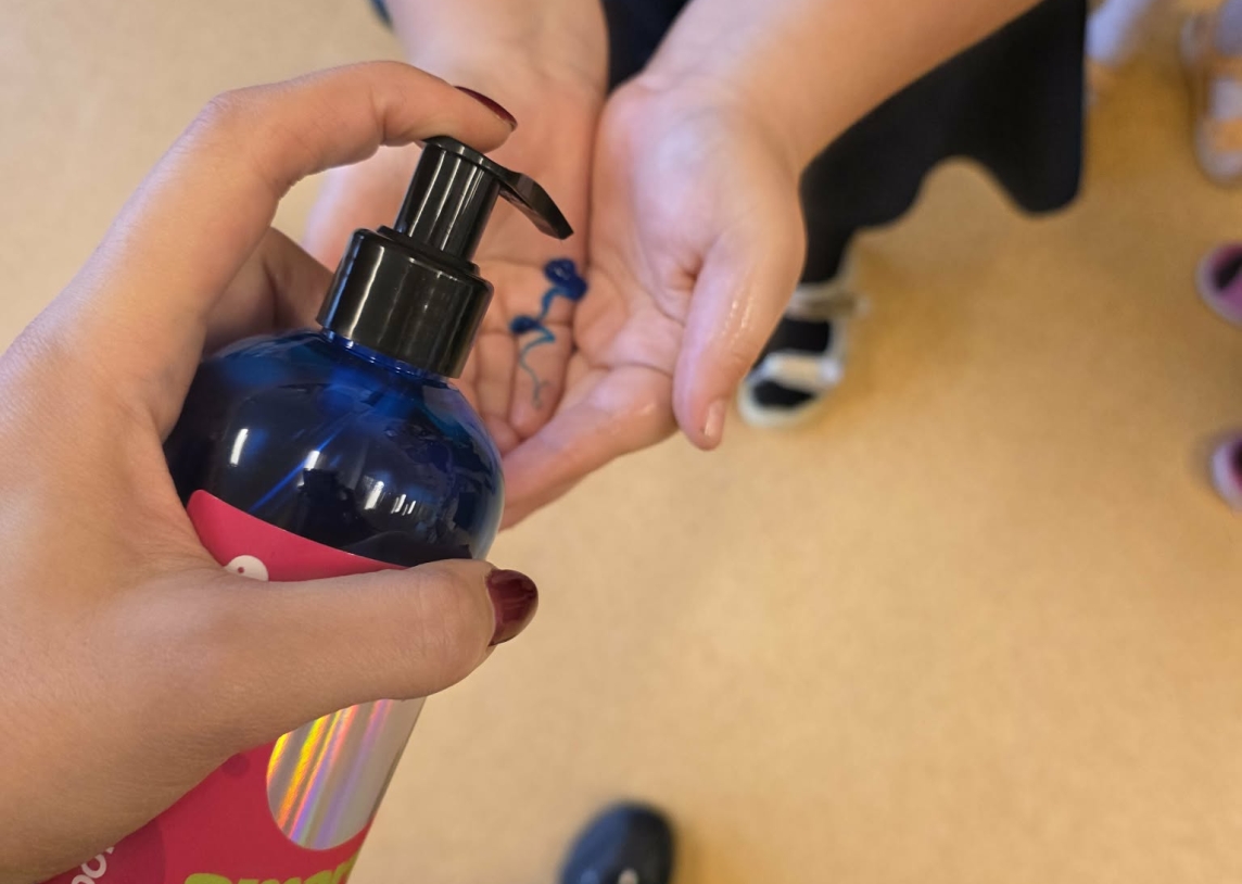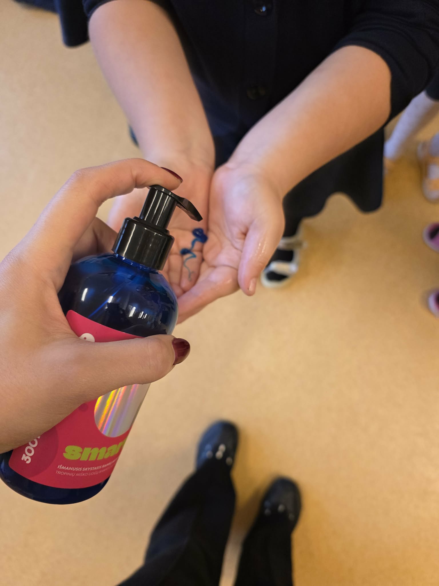Edukacinių pamokų metu naudojome Smarter Soap – išmanųjį skystą rankų muilą. Smarter Soap pasižymi specialia formule, su ryškia spalva, todėl vaikai galėjo smagiai ir interaktyviai plauti rankas. Kiekvieno plovimo metu, jie atpažino visas netaisyklingai išmuiluotas vietas ir užtikrino, kad jų rankos būtų visiškai švarios.