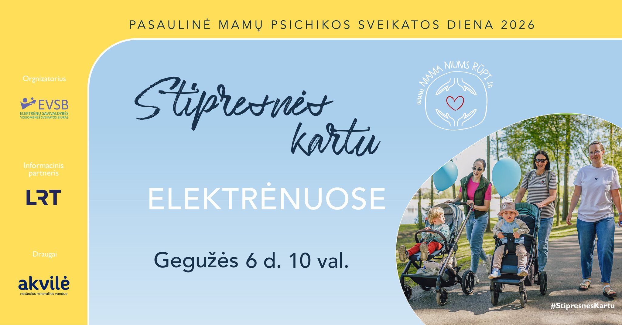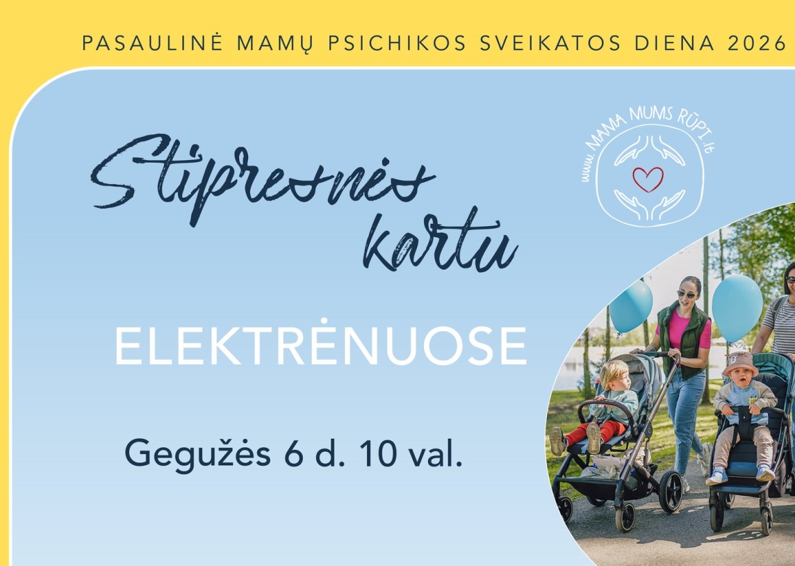 Mamos kartais eina. Kartais – bėga. Dažnai pavargsta. Bet kasdien vėl keliasi ir eina paskui savo vaikus. Motinystė – tai visas emocijų spektras, kuriame telpa ne tik džiaugsmas, bet ir nuovargis, nerimas, liūdesys ar perdegimas. Šiemet Pasaulinę mamų psichikos sveikatos dieną Lietuvoje minime jau ketvirtą kartą, kviesdami į pasivaikščiojimus „Stipresnės kartu“, kurie vyks daugiau nei 30 Lietuvos miestų, tarp kurių ir Elektrėnuose. Tai paprastas susitikimas ir pasivaikščiojimas, skirtas pabūti kartu – su kitomis mamomis, šeimomis ir žmonėmis, kuriems rūpi mamų emocinė sveikata. Tai nėra sporto renginys – eisime ramiu tempu, su vežimėliais, su vaikais ar tiesiog savo žingsniu.
