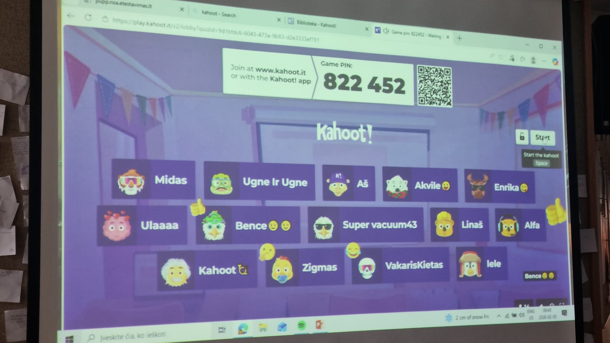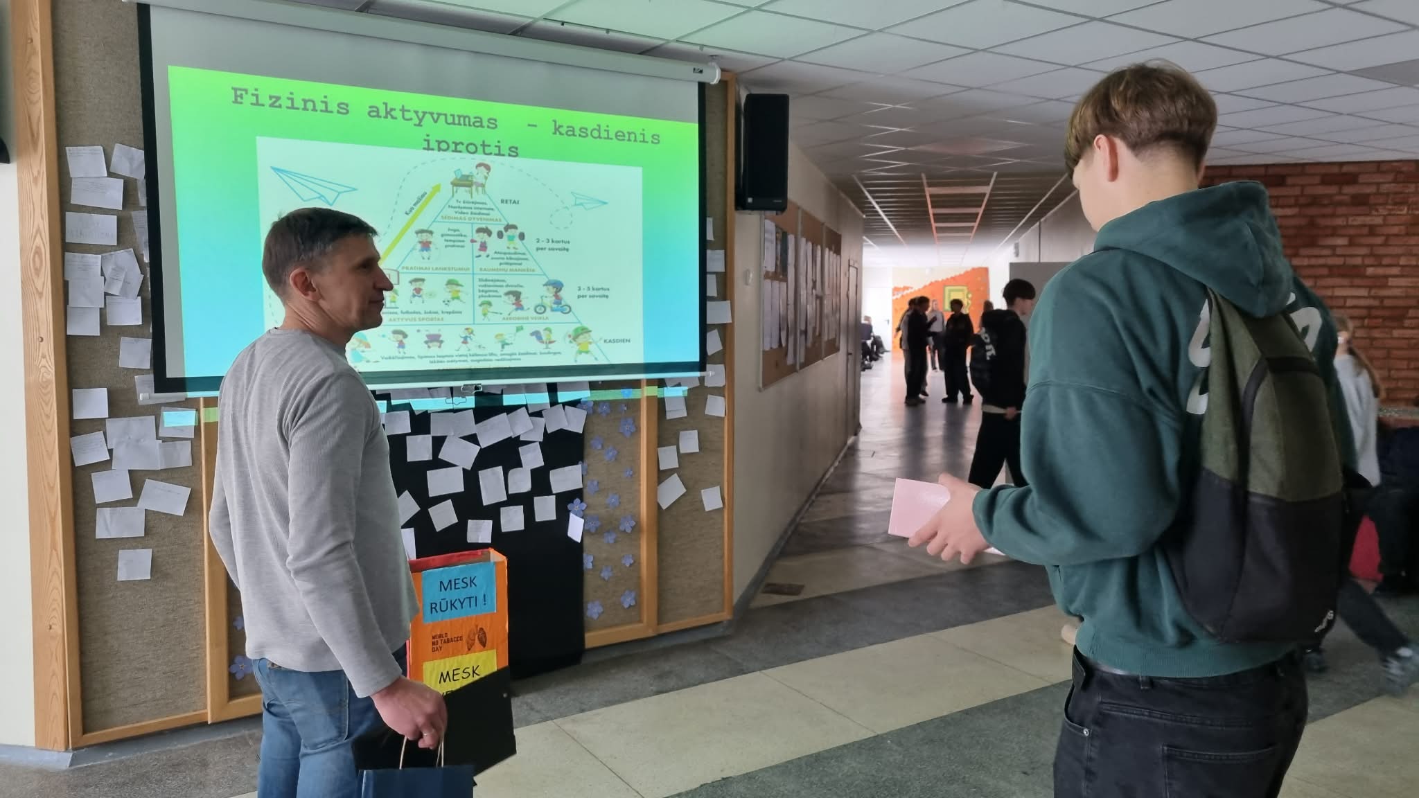 Pertraukų metu fizinio ugdymo mokytojas K. Karsokas kvietė mokinius judėti, žaisti linksmus žaidimus ar aktyviai praleisti laiką su draugais. Fizinis aktyvumas pagerino nuotaiką, sustiprino bendruomeniškumo jausmą. Buvo surengta viktorina Sveikų iššūkių mėnesiui paminėti, kurią sveikatos specialistei R. Šliužaitei padėjo vesti Sveikatono dalyvės U. Dediuchina ir Ugnė Jankūnaitė. Socialinė pedagogė A. Gaučienė mokinius skatino įtvirtinti žinias apie Elektroninių cigarečių žalą sveikatai žaidžiant Kahoot žaidimą.