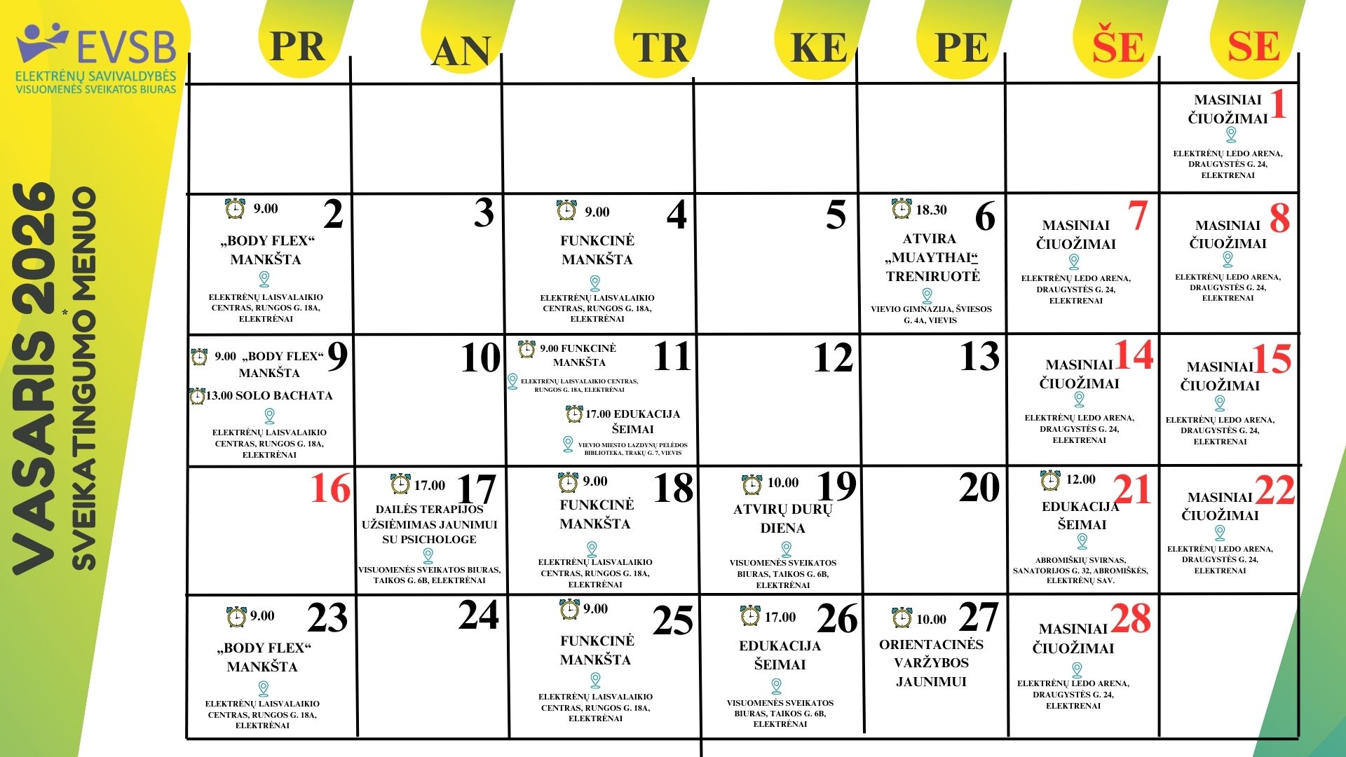 Elektrėnų savivaldybės visuomenės sveikatos biuras kviečia aktyviai registruotis ir dalyvauti NEMOKAMUOSE užsiėmimuose bei veiklose visą vasario mėnesį!
